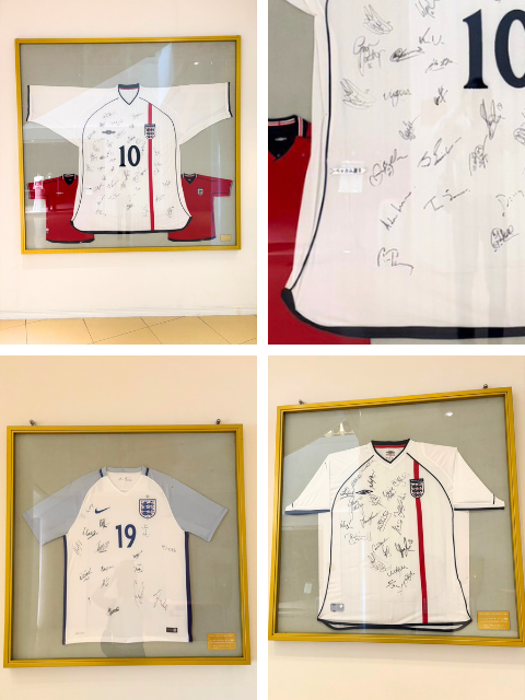 館内には選手たちのサイン入りユニフォームが展示されており、「ベッカムのサインもどこかに…分かります?」と、社長もにっこり🧐⚽