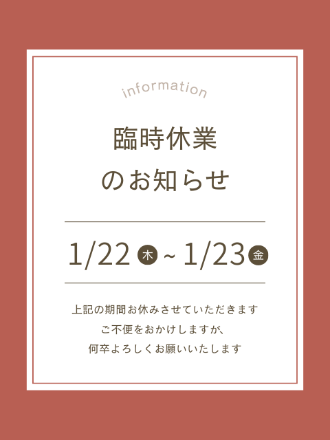 なお、臨時休業中にいただきましたお問合せにつきましては、1月26日(月)より順次対応させて頂きます。
